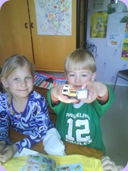 After lunch we opened presents. He got an elaborately drawn road from Zander, some cars from Callie, a pegboard set from me and André and TONS of stuff from the wonderful Grammie (cars, train book with stickers, buses, animal stickers and car stickers) Are you getting an idea of what he likes? Here are some shots of him opening gifts. The sticker book was probably his favorite – he has already spent hours sticking stickers from it on paper (all on top of each other – which drives me crazy – but hey, it’s his stickers) and his big brother is also in love with this book – he’s hoping for one as well (though I think he is mostly just jealous)