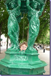 meant attempting to dip their heads right into the water. They saw a bum cleaning off and figured it was the only proper thing to do. We also saw another example of a unique water fountain. Instead of the water bubbling up from below, it rained down from above, supported by 4 beautiful ladies. Zander really loved this fountain – can you find his little head peeking out from behind it? I ha